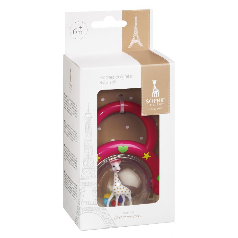 Díky držadlu jej dítě může snadno uchopit a průhledná bublina s malou žirafou Sophií uvnitř se otáčí kolem dokola. Zatřeste a užívejte si jemné chrastění barevných kuliček.