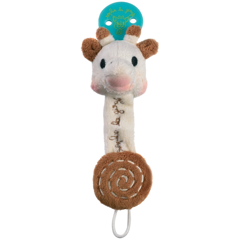Zábavný klip s držákem na dudlík s žirafkou Sophií a malou rolničkou je vyrobený z měkkého materiálu. Díky upevňovacímu klipu se držák snadno připíná na dětské oblečení. Praktický doplněk, který zabraňuje ztrátě dudlíku nebo jeho neustálému padání na zem a následnému ušpinění.
