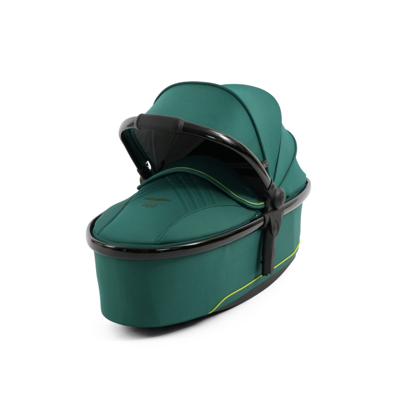Hluboká korba Aston Martin egg3® je dokonalým ztělesněním luxusu i díky signifikantnímu lemování v limetkové barvě. Dále je zde zahrnuto kožené madlo Bridge of Weir a odvětrávaná stříška s ochranou UPF 50+. O pohodlí novorozence se stará prodyšná matrace Sorona® a houpací lišty, které jemně kolébají při odpočinku v interiéru domova. Nánožník zdobí ikonické prošívání DBX707 odkazující na automobilové dědictví, zatímco ergonomické uvolňovací madlo čerpá inspiraci ze stejného motivu, přetvořeného do precizně zpracovaných kovových detailů. Korba je schválena pro celonoční spánek a zajišťuje absolutní komfort jak doma, tak na cestách.