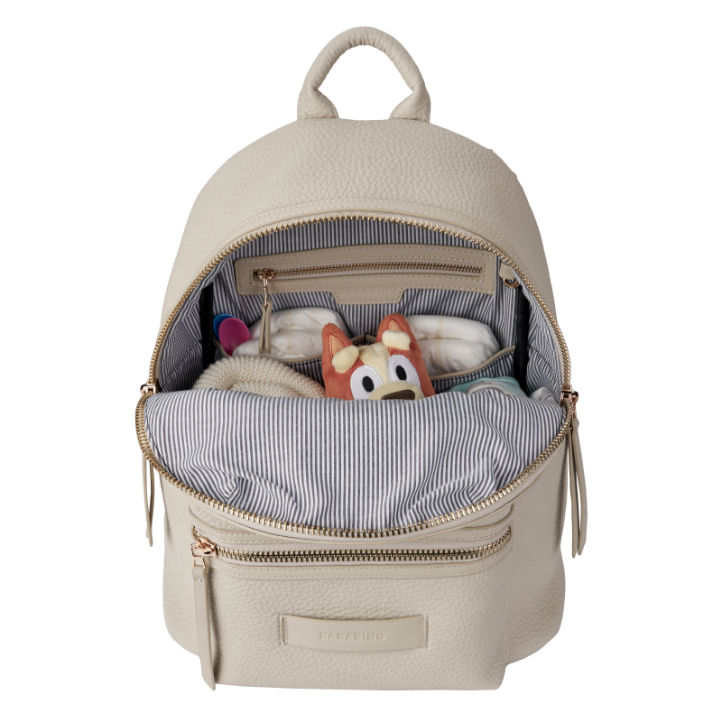 Přebalovací taška Bababing Luca z veganské kůže, která je udržitelně stylová a připravená na dobrodružství, zajišťuje dostatek prostoru pro nezbytné věci pro miminko, praktické "rodičovské kapsy" na cennosti a samostatnou kapsu na malý (nebo ne tak malý) nepořádek.