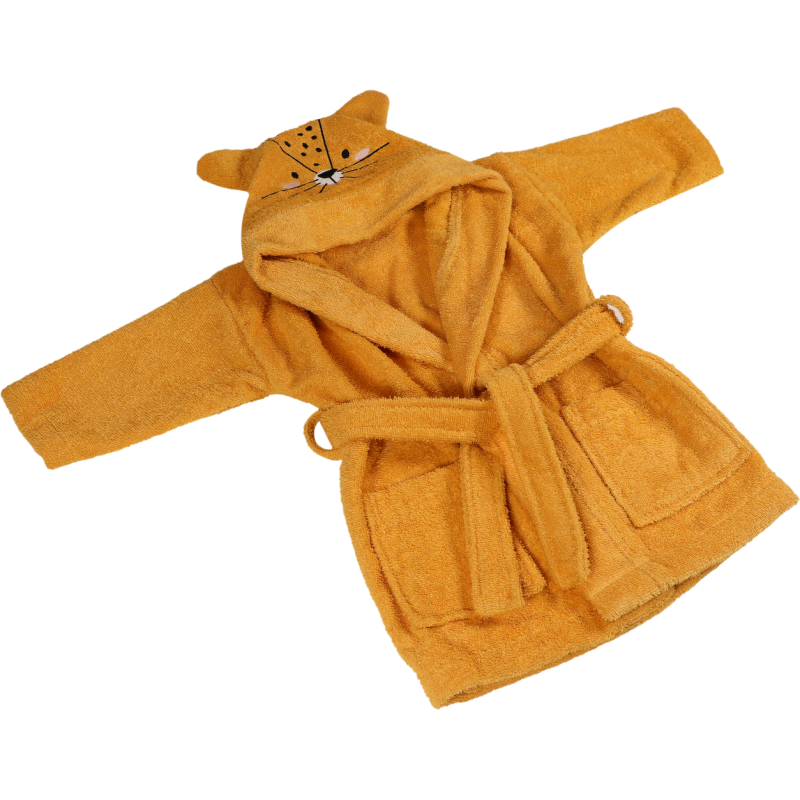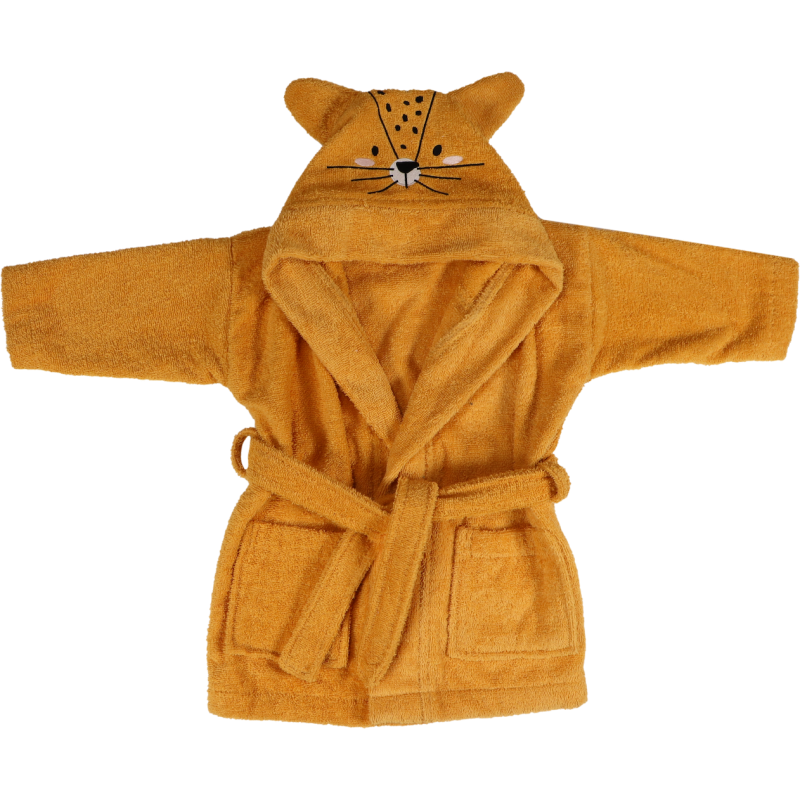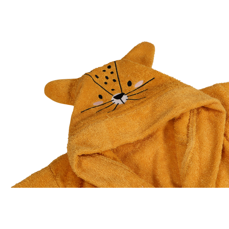 This bathrobe has a cute face and the ears of Lenny the Leopard when the child puts on the hood.