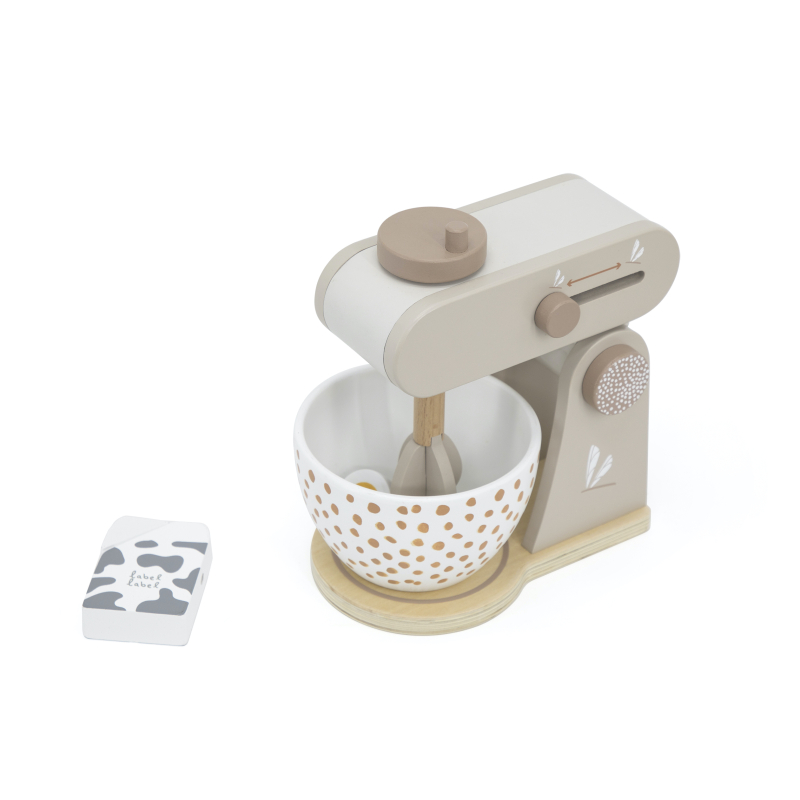 This Label Label kitchen robot is just what the little chefs need to bring their imaginary creations to life. The mixer is raised so that all ingredients in the mixing bowl can be added. Bring it back down and stir! By rotating the lever at the top, the mixer will mix all the ingredients. The slider can be used to set the mixing speed. Baking pleasure is assured! The set is complete with the included accessories: an egg to break open and of course a briquette of milk to add to the pastry.