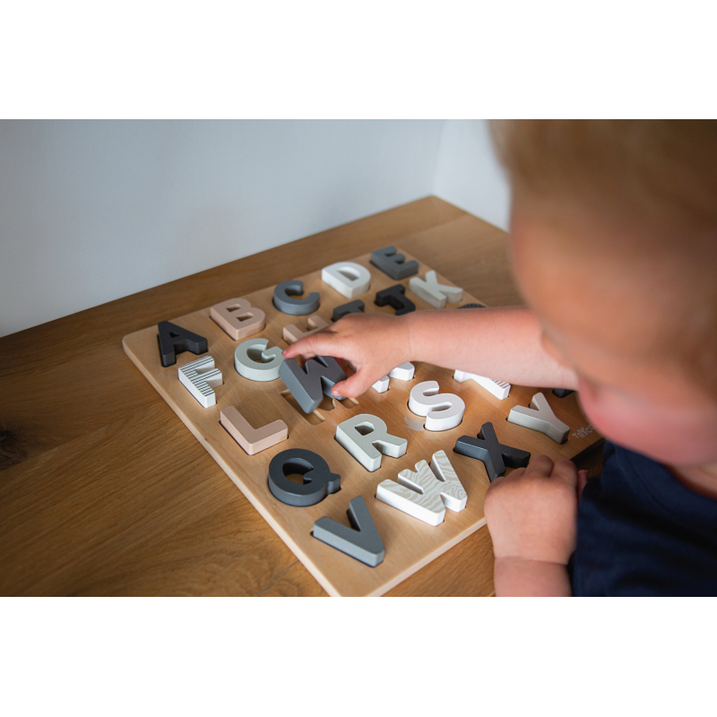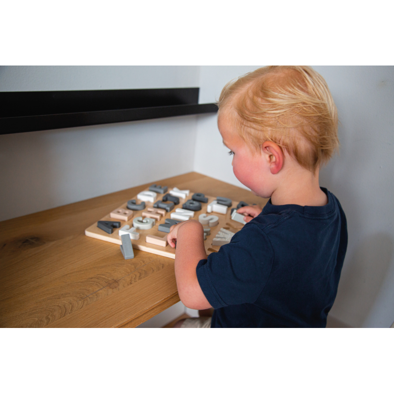 With this alphabet board the child gets acquainted with letters. The letter cubes are loose on the board, so they have to be placed in the right place. The other side of the board has a chalkboard, so the child can write along with the supplied chalk.