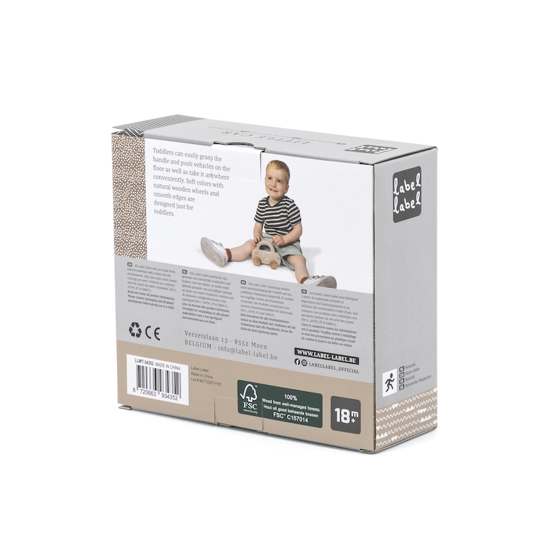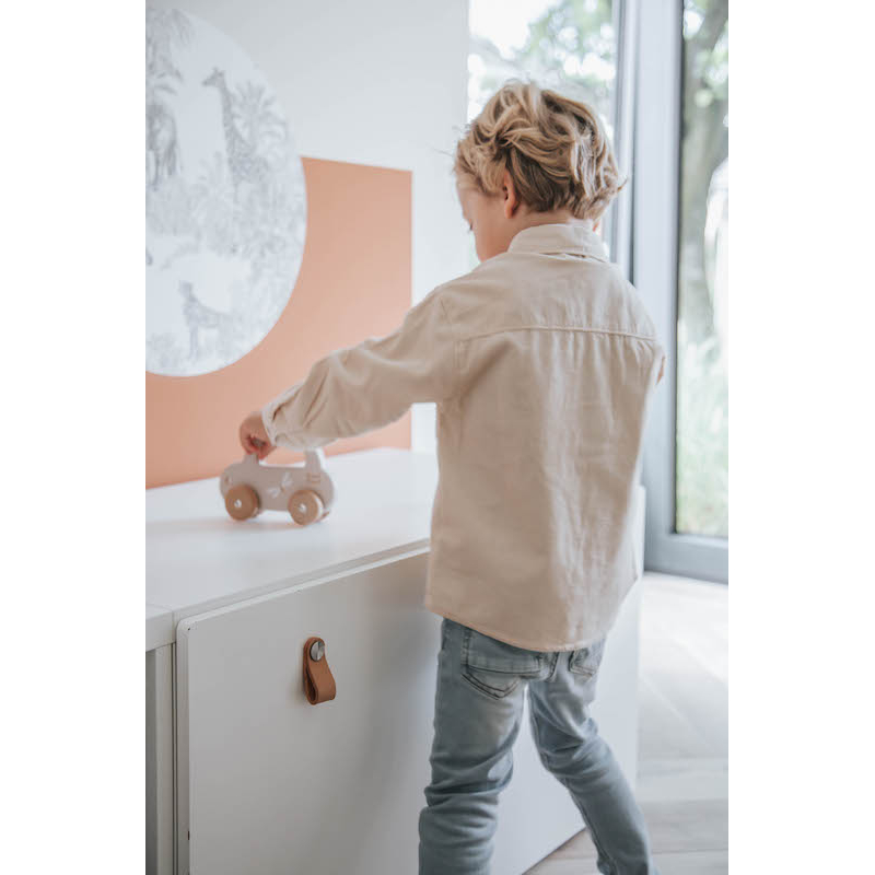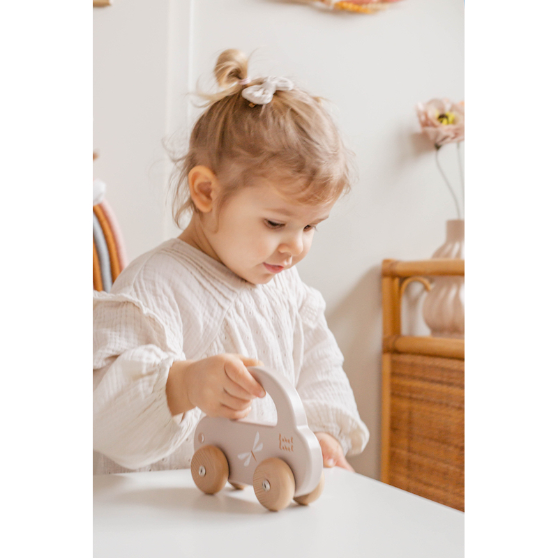 Toddlers easily grab the car by the handle to let the car drive or take it wherever it wants. The streamlined design of the car, the soft colours in combination with natural wooden wheels are perfect to stimulate and develop your toddler's motor skills.