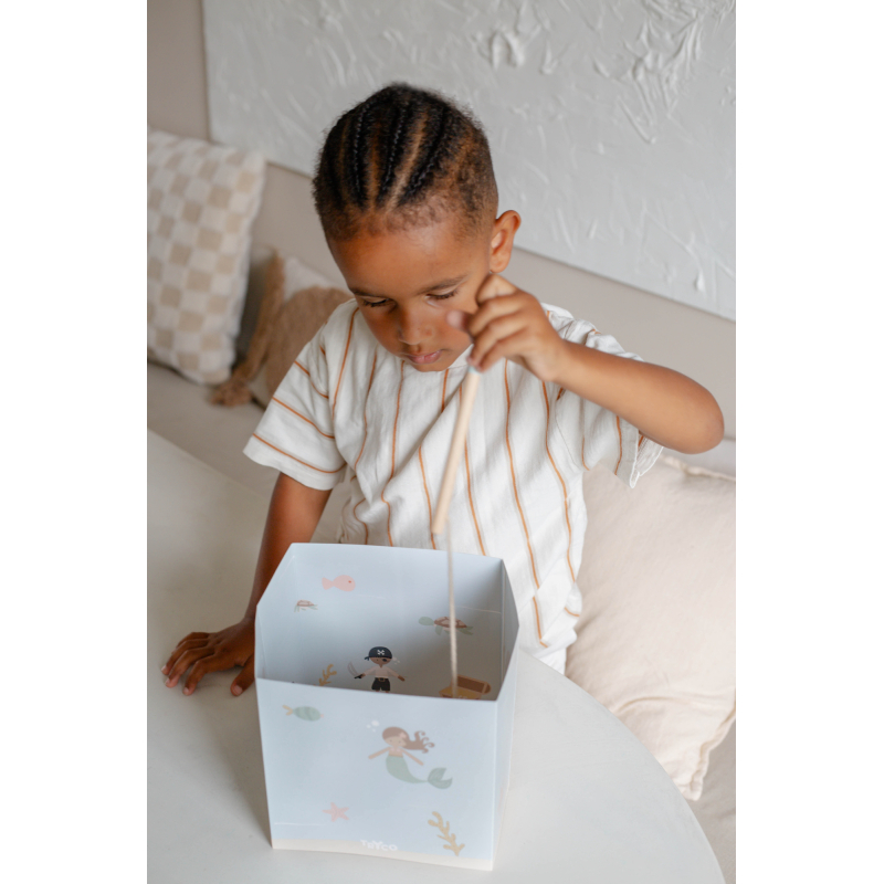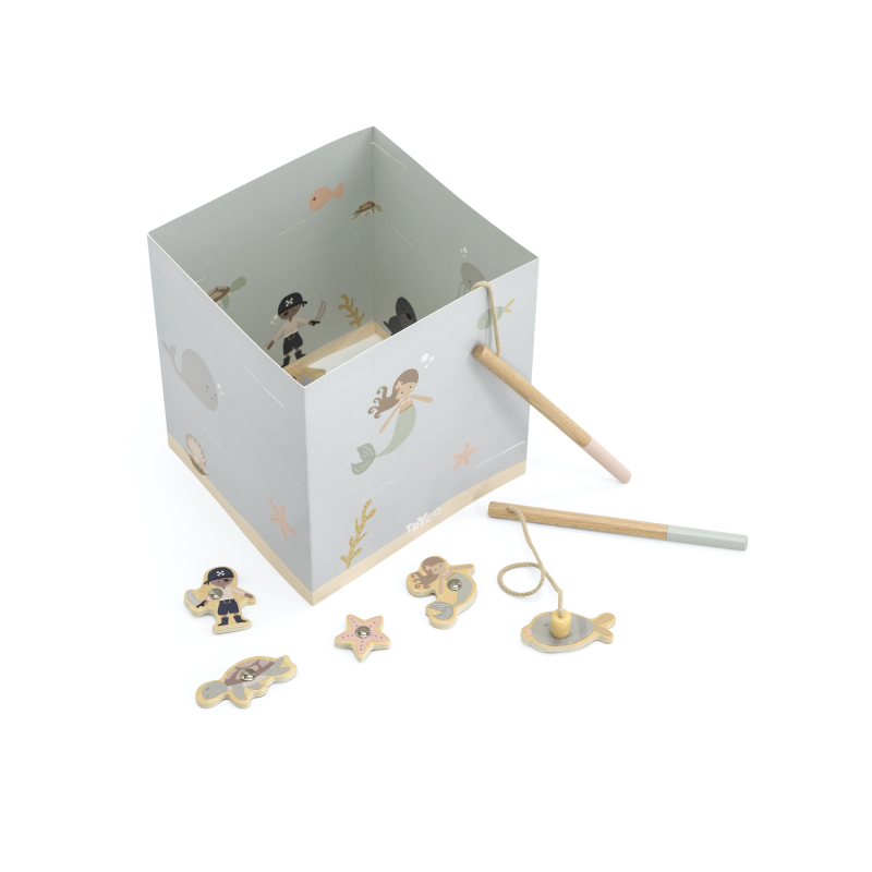 Obsahuje 13 drevených kociek, 2 udice a akvárium z hrubého kartónu.