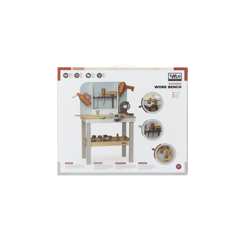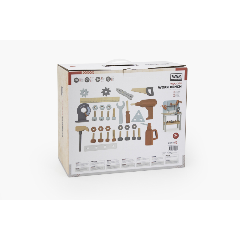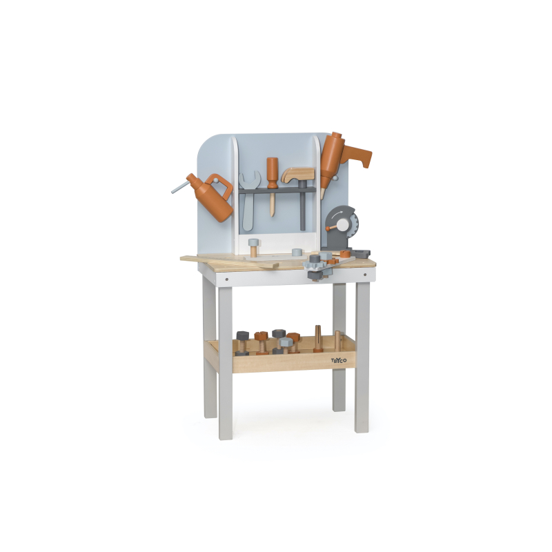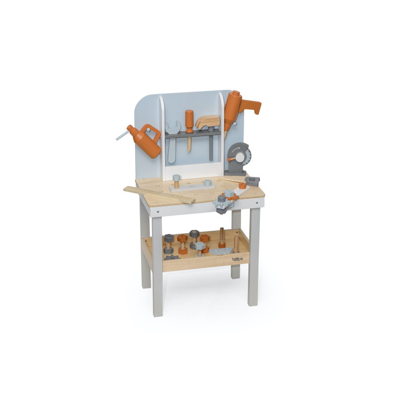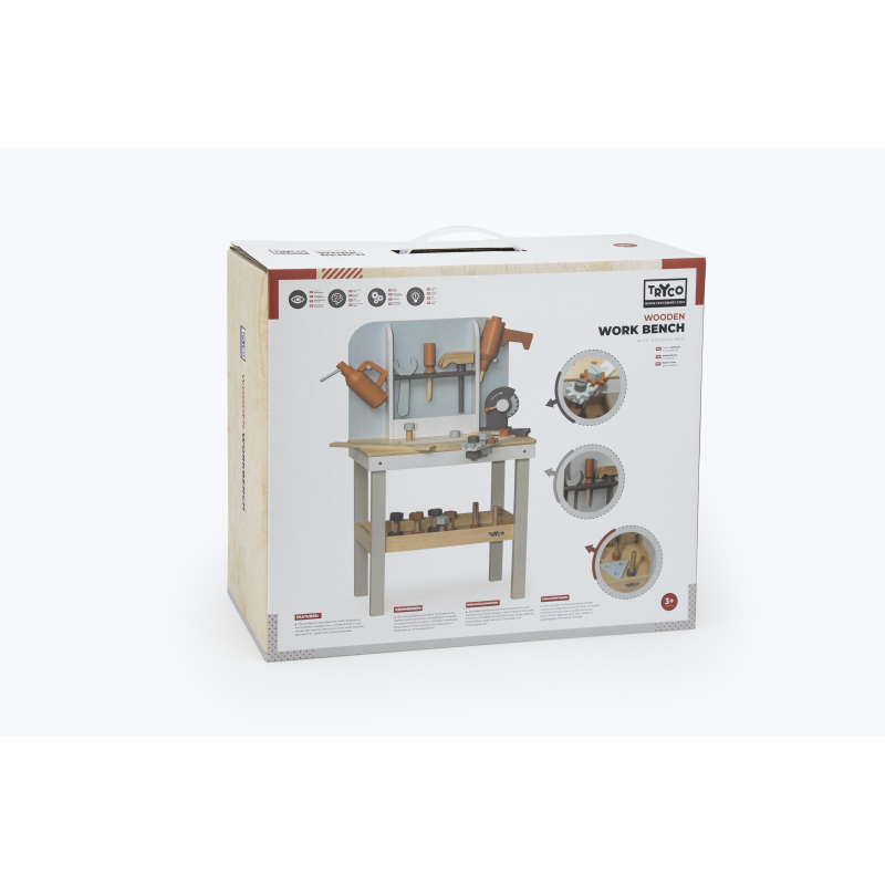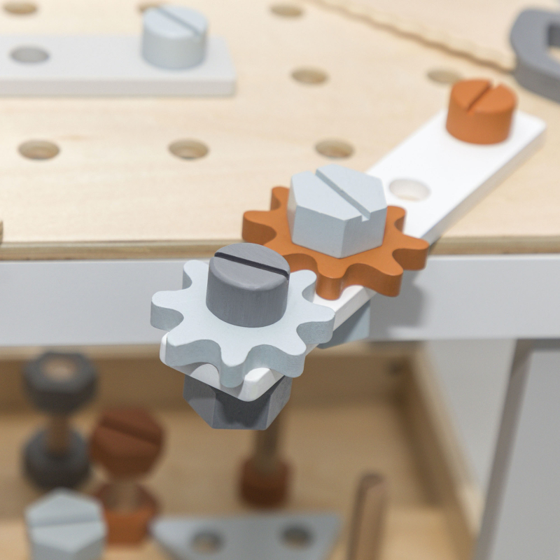 Vďaka tomuto drevenému pracovnému ponku dieťa formou hry stimuluje svoju predstavivosť a rozvíja motorické schopnosti.