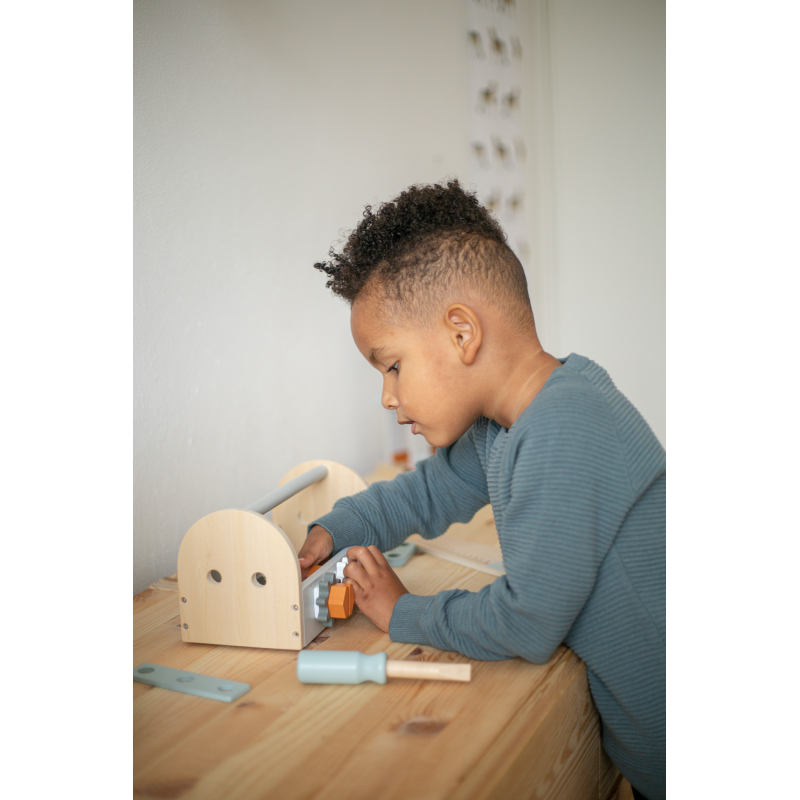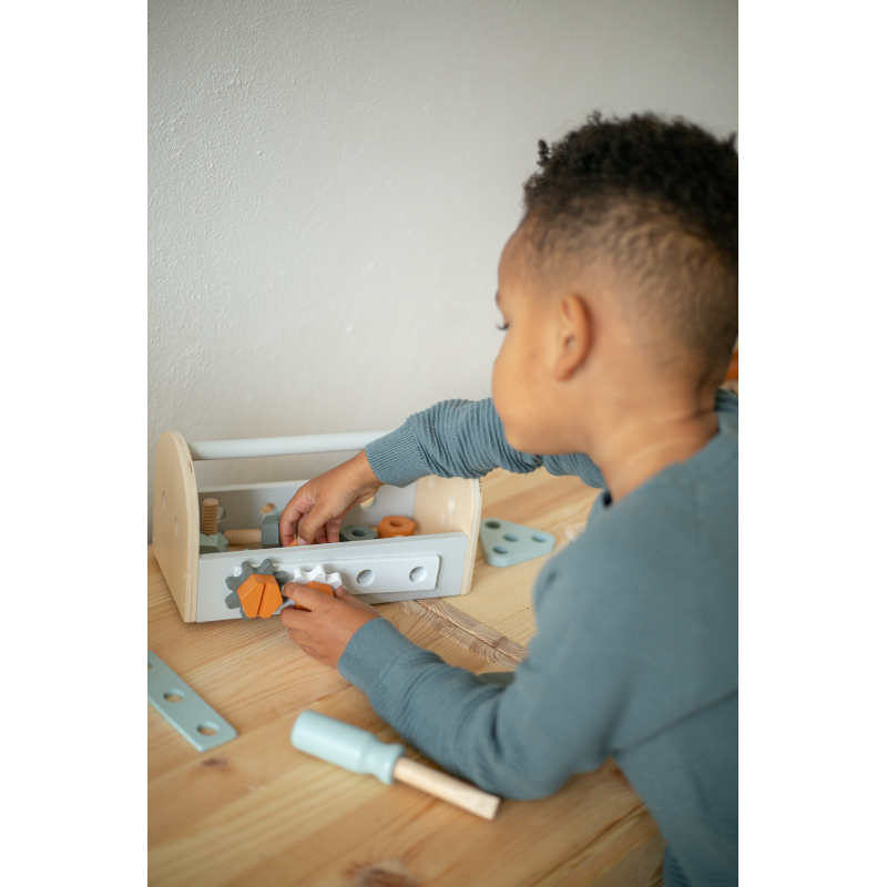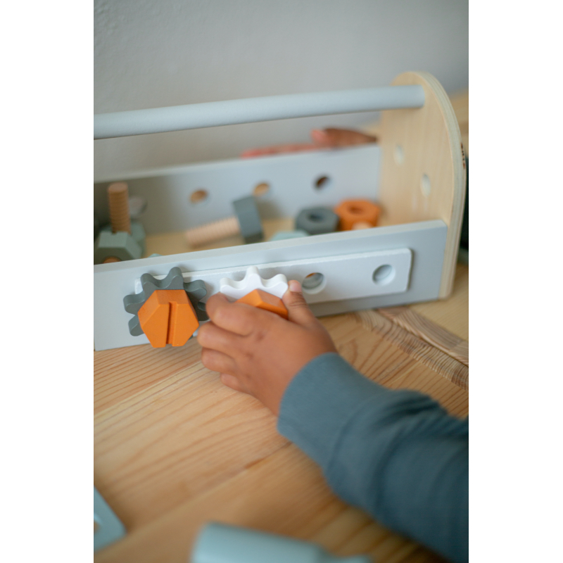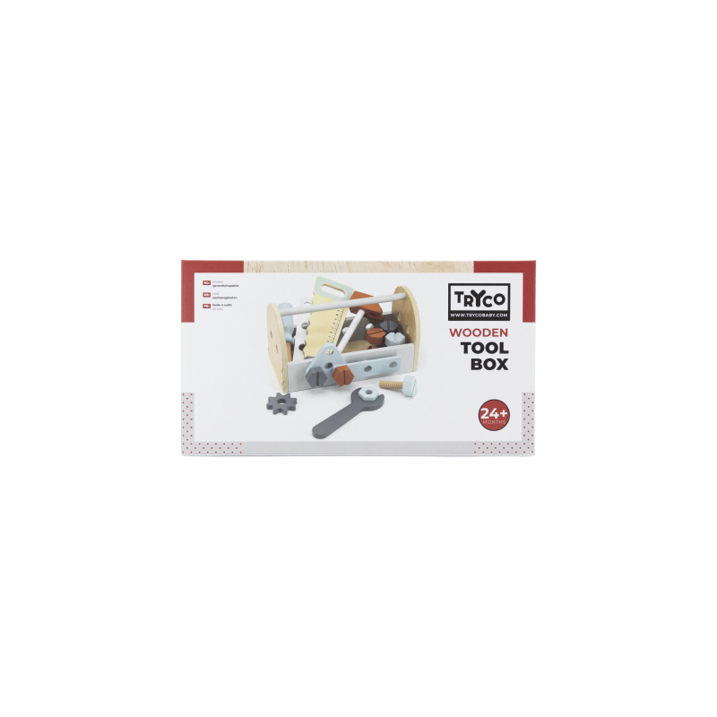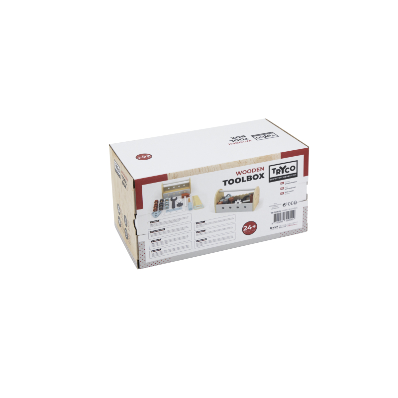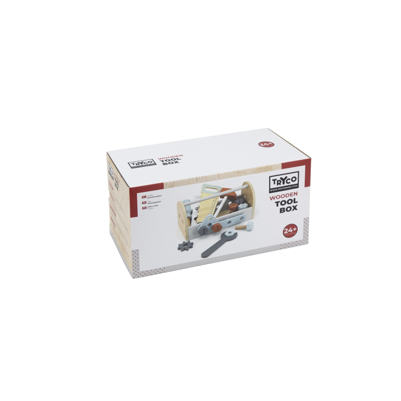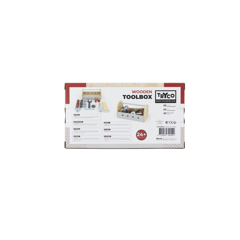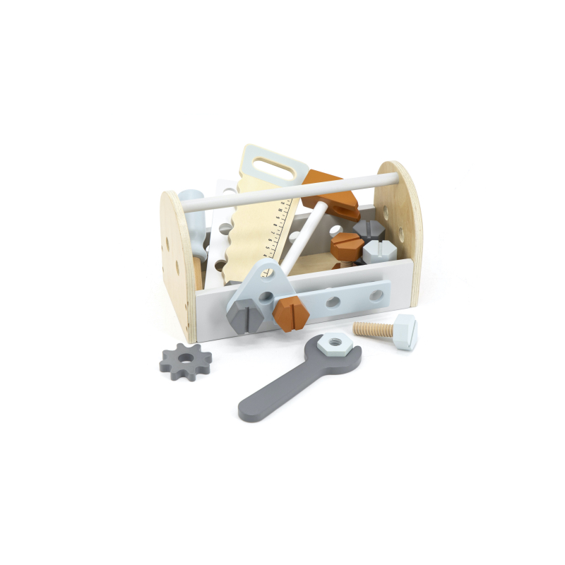 Tento nádherný drevený box na náradie obsahuje 6 matíc, 6 skrutiek, 2 ozubené kolieska, kľúč, pílku, skrutkovač a kladivko.