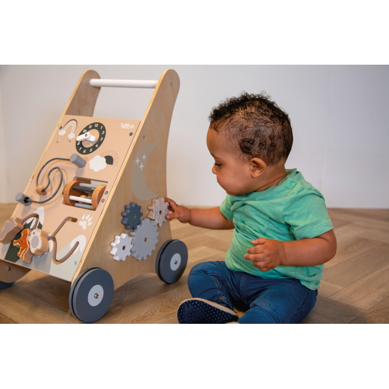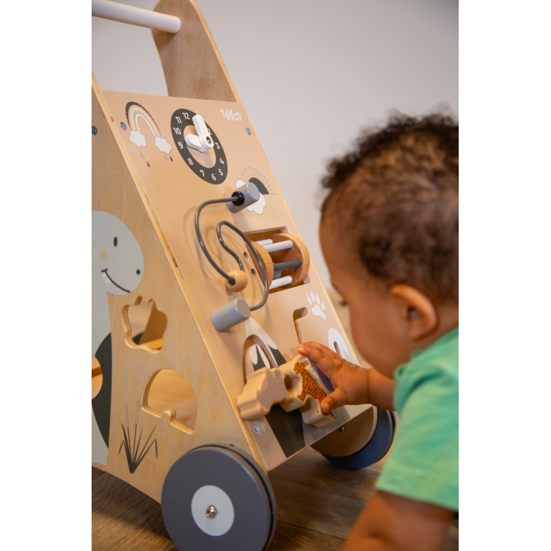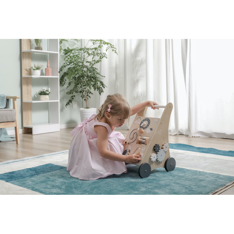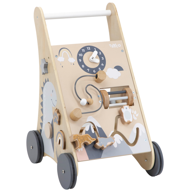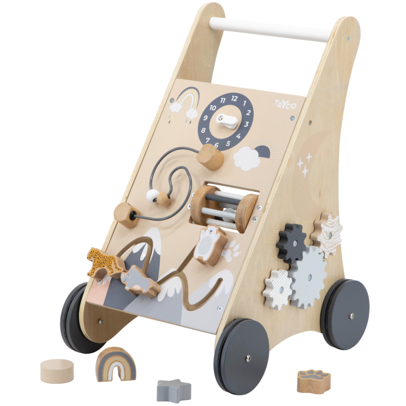 Drevené chodítko zábavnou formou rozvíja motoriku, zmyslové schopnosti a samozrejme aj chôdzu. Vozíček zahŕňa rôzne aktivity, ako sú hodiny, korálková špirála, hrkálka, posuvné kocky a otáčavé ozubené kolieska. Naozaj dostatok podnetov na hodiny zábavy!
