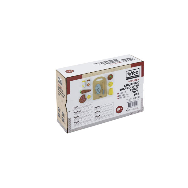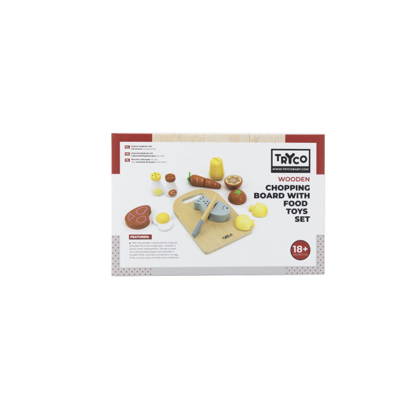 Sada je vhodná na rozvoj motoriky a skladá sa z dosky na krájanie, koreničky a soľničky, dreveného noža, paradajky, huby, vajíčka, mrkvy, kúska mäsa a ryby.