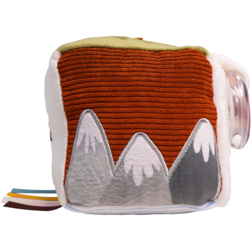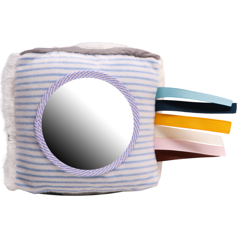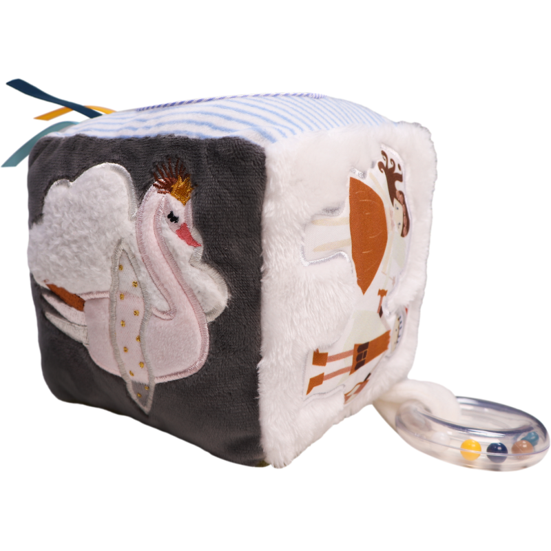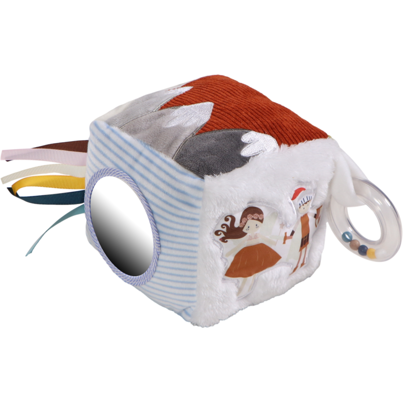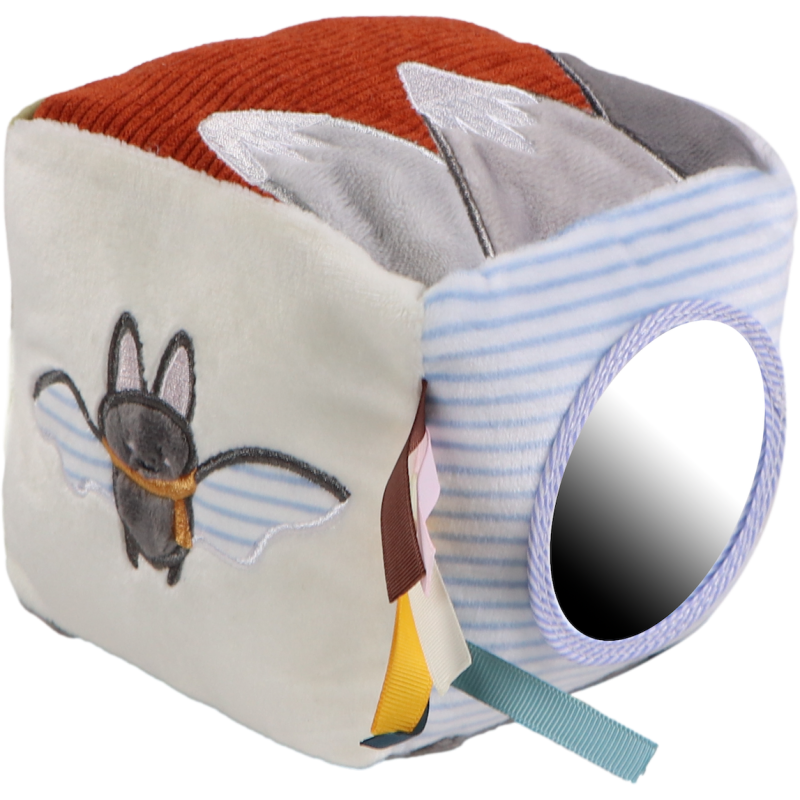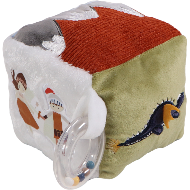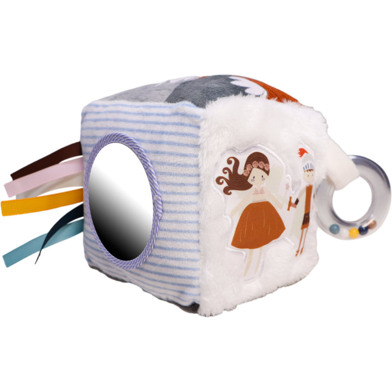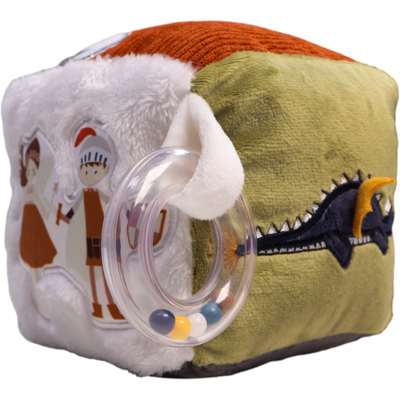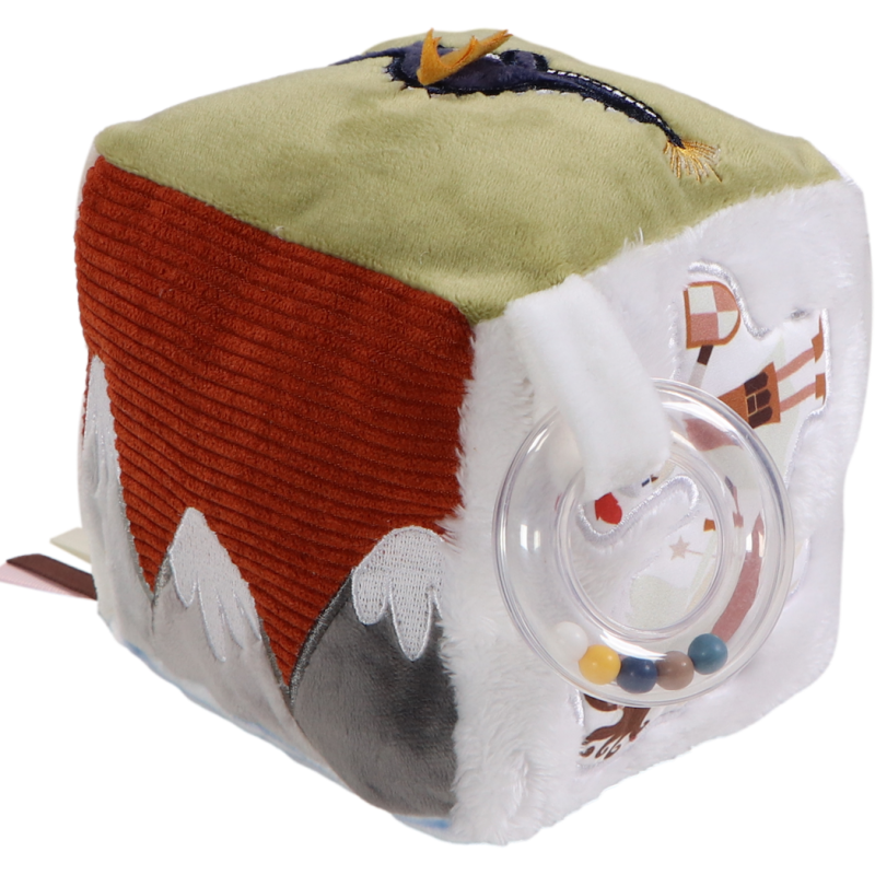 Kocka je celá v motíve Fantasy, na každej strane je niečo iné, čo môže dieťa objavovať! Kocka obsahuje napríklad zrkadlo, textilné prúžky, hrkálku a tiež krídla draka Diega, ktoré bude dieťa chytať.