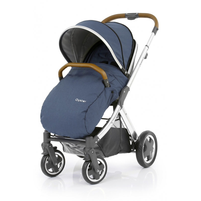 Kočárek Oyster 2 s chromový rámem Mirror - zahrnuje chromový vysoce leštěný rám s koženkovou rukojetí, sedací část & pláštěnku včetně textilního setu k sedací části (balení zahrnuje stříšku, podložku, redukční podložka pro miminko, nánožník & tašku na textilní části)
