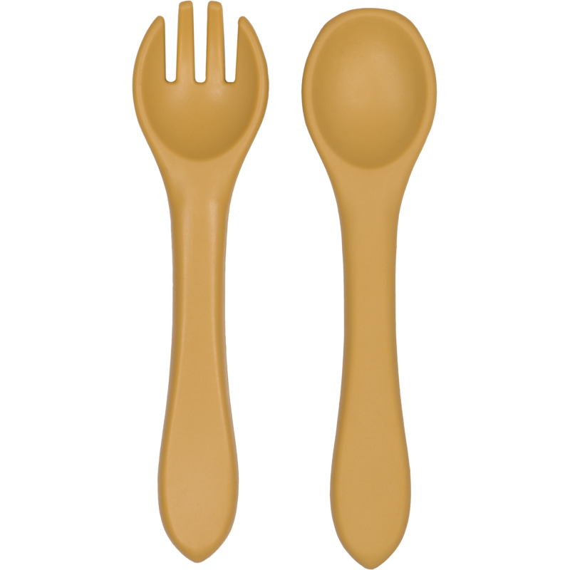 Táto súprava detského príboru pozostáva z vidličky a lyžičky, ktoré sú vyrobené zo 100% silikónu (certifikát LFGB). Tvar ich rukoväte je vhodný pre malé detské ruky.